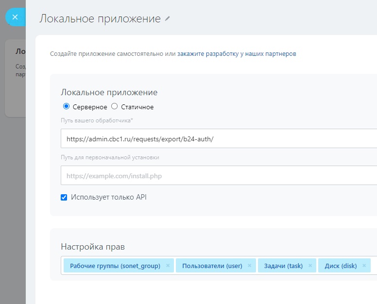 Чтобы настроить интеграцию на стороне своего портала Битрикс24 необходимо создать "локальное приложение" (см.