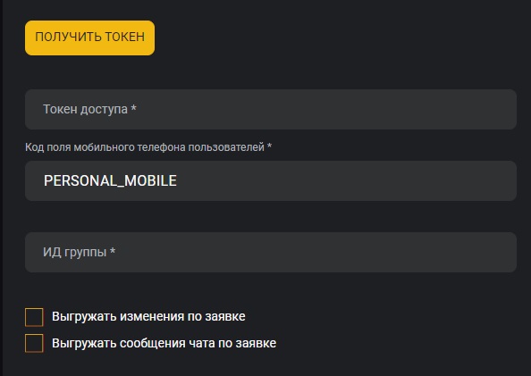 - ИД группы - группа/проект, в которой будут создаваться задачи. В группе обязательно должен быть включен функционал "Диск", иначе файлы по заявкам не будут выгружаться.