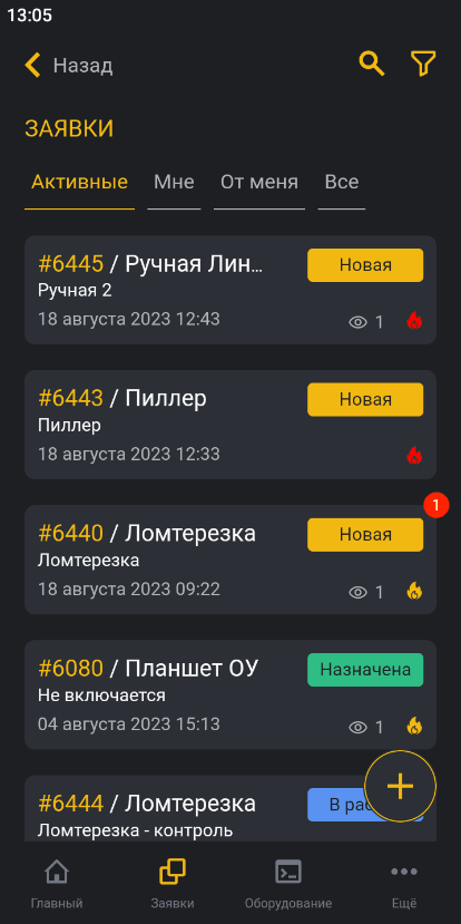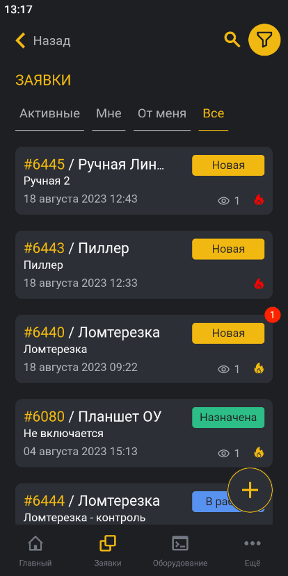 - Активные — заявки в статусе Новая, Назначена, В работе, Приостановлена (список активных заявок всегда выбран по умолчанию)