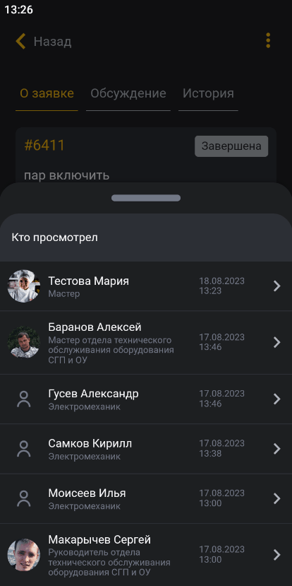 - Просмотрели — перечень пользователей, которые посмотрели заявку