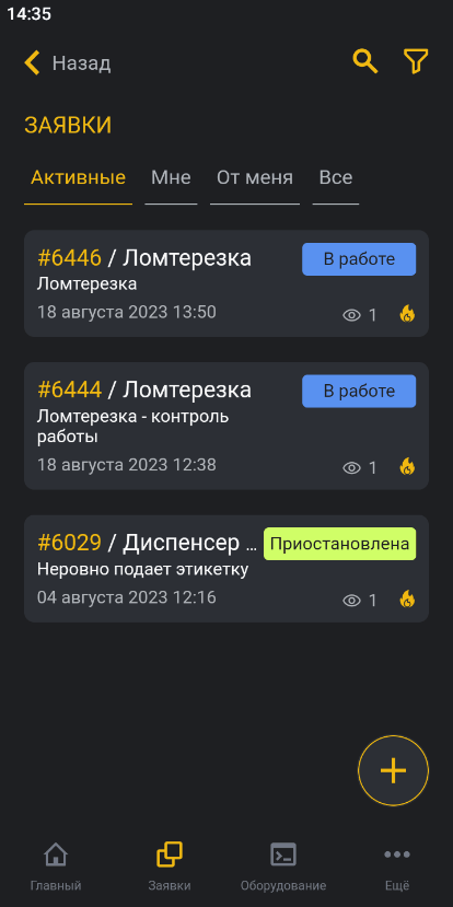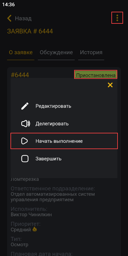 В любой момент вы можете возобновить работу над заявкой — просто нажмите кнопку ⋮ в правом верхнем углу и выберите пункт Начать выполнение. Заявка вновь перейдет в статус В работе.