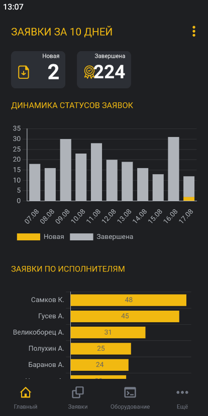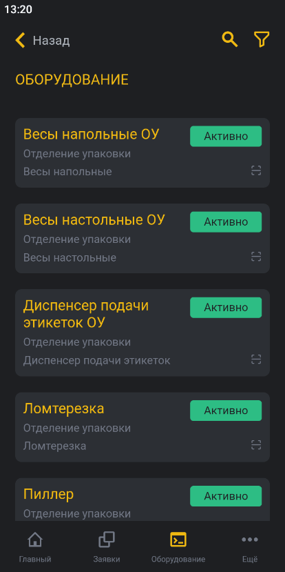 По каждому оборудованию отображается мини-карточка со следующей информацией: