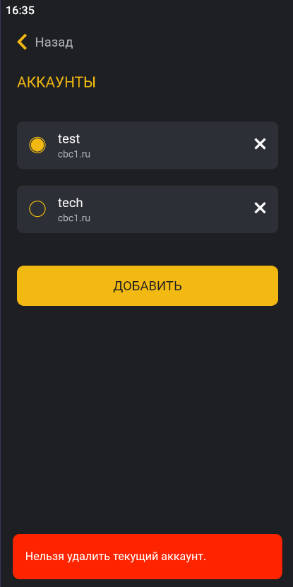 Внимание! Удалить активный аккаунт невозможно — отобразится уведомление.